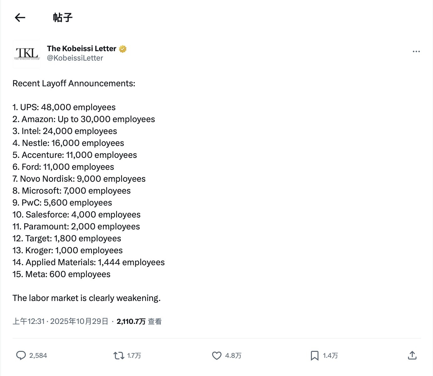 10月31日消息,当联合包裹(UPS)的4.8万份解雇通知、亚马逊近3万人的优化计划,与Meta的600人裁员清单并置时,一组冰冷的数字描绘出全球就业市场的剧烈震荡。
