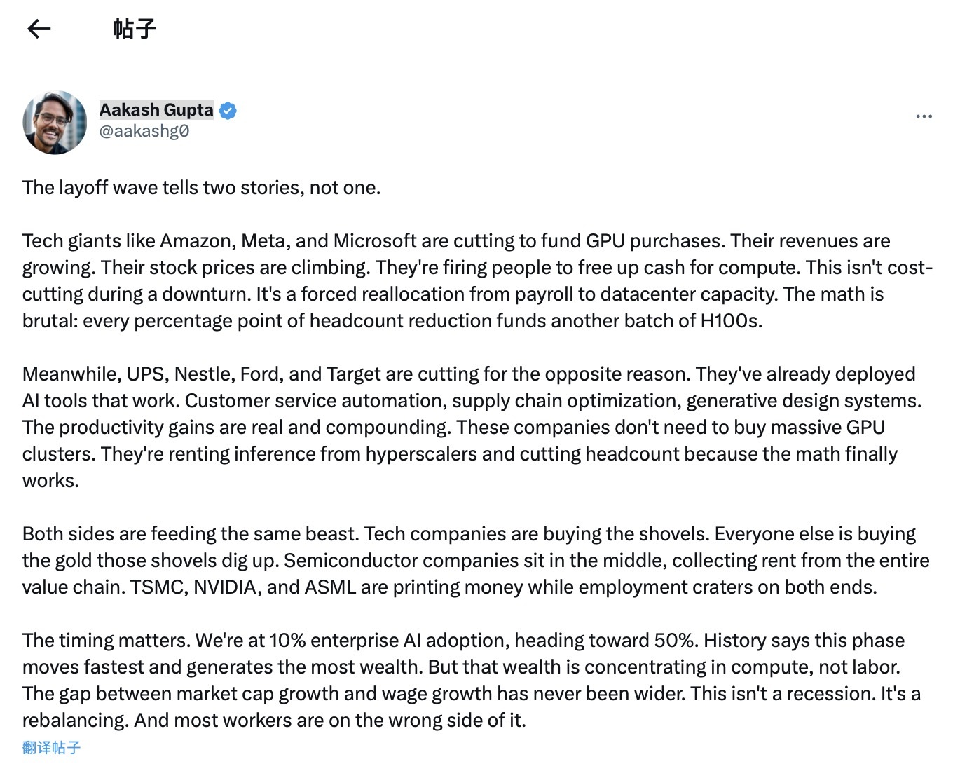 美国科技界专家阿卡什·古普塔 (Aakash Gupta)就此在社交媒体平台X上发帖指出,这场AI时代的裁员潮呈现出鲜明的“双城记”特征,不同行业的企业沿着两条路径完成人员优化,却共同指向“减少人力投入”的终点。