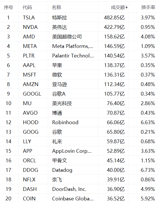 第2名英伟达收跌3.65%,成交422.79亿美元。