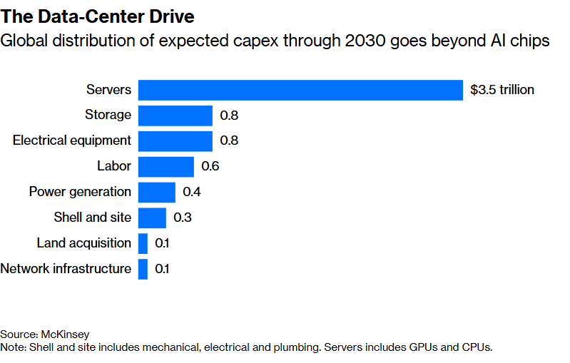 数据中心驱动力——到2030年为止预期资本开支在全球的分布,远远超出英伟达/AMD AI芯片本身