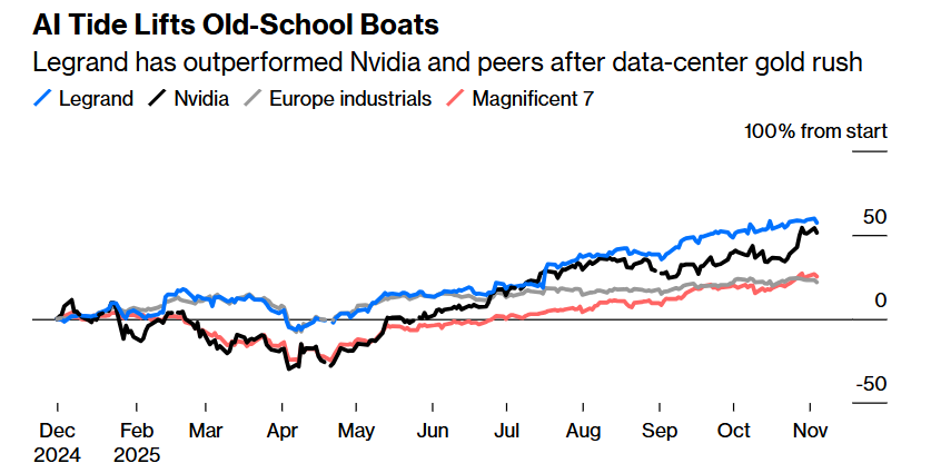 通往“虚拟神性”的AI竞赛,已经撞上了土地、劳动力和电力等“人类技术尺度”的瓶颈。而欧洲那些近年来平平无奇的传统工业巨头们,包括法国的罗格朗公司(Legrand SA)和施耐德电气公司(Schneider Electric SE)(两家工业巨头都创立于 19 世纪),则热切地为这场AI数据中心淘金热提供“镐头和铁锹”,其中罗格朗公司今年以来股价走势甚至大幅跑赢“AI芯片超级霸主”英伟达。