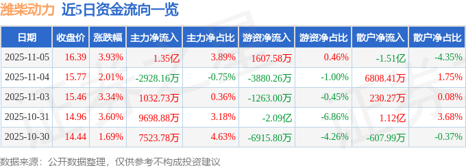11月5日的资金流向数据方面,主力资金净流入1.35亿元,占总成交额3.89%,游资资金净流入1607.58万元,占总成交额0.46%,散户资金净流出1.51亿元,占总成交额4.35%。