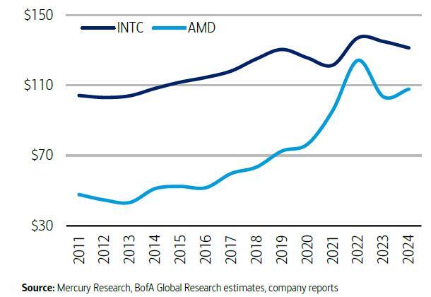 从ASP上看,AMD的芯片价格自2012年之后奋起直追,至2024年AMD产品均价已接近翻倍,而同期英特尔却只上涨了30%左右。