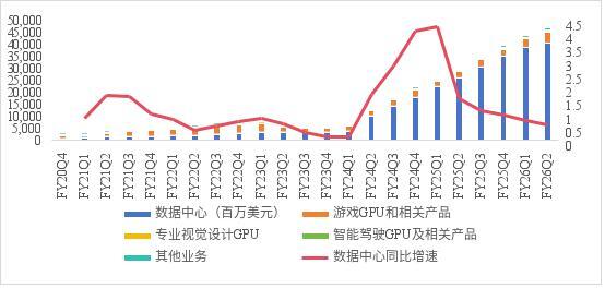 受益于垄断带来的高定价和高毛利,近两年英伟达的基本面呈现加速扩张趋势。财报数据显示, 从23下半年开始,英伟达的数据中心业务营收持续高增,截止FY26Q2(至25年7月底)单季度营收高达411亿美元,连续九个季度维持高增速。