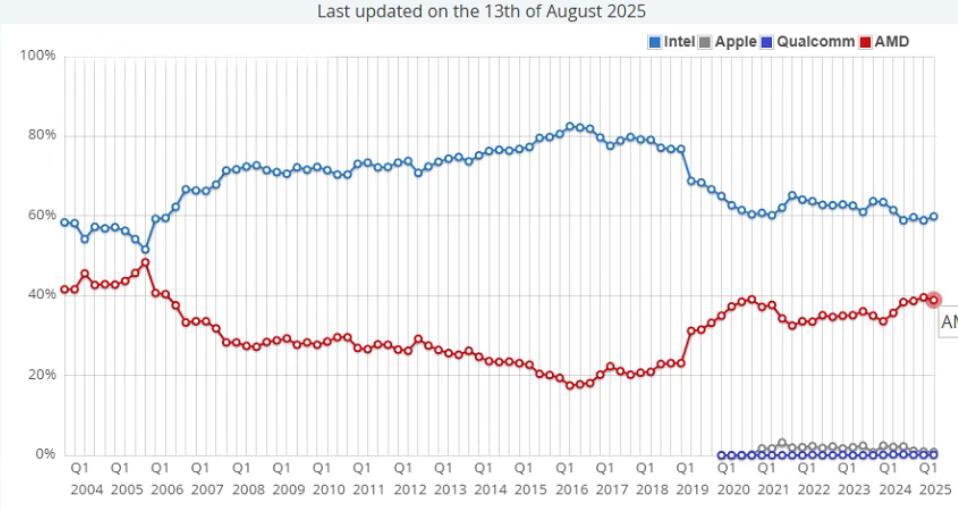 2016年AMD在CPU市场的份额不到18%,然而到2019年却重新站上30%,最新市占率在39%左右,并长期维持双寡头的格局。
