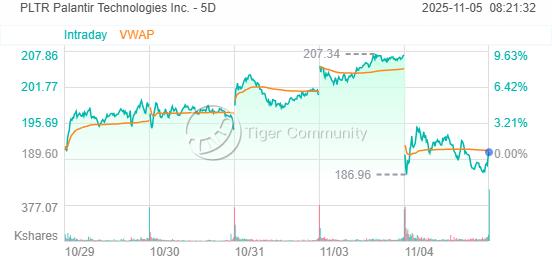 Palantir三季报业绩表现强劲但股价仍然下挫,反映出投资者对AI相关股票估值的担忧正在加剧。该公司远期市盈率达228倍,远高于市场平均水平。周一,Palantir报190.74美元/股,今年以来已累计上涨152.2%。