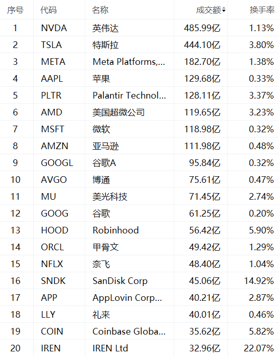 第5名Palantir收高1.65%,成交128.11亿美元。