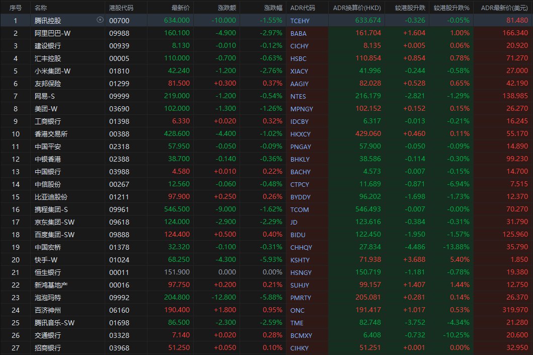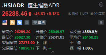 智通财经APP获悉,周五,美股三大指数涨跌不一。恒生指数ADR上涨,按比例计算,收报26288.46点,较香港收市涨46.63或0.18%。大型蓝筹股涨跌不一,汇丰控股收报110.854港元,较香港收市涨0.78%;腾讯控股收报633.674港元,较香港收市跌0.05%。
