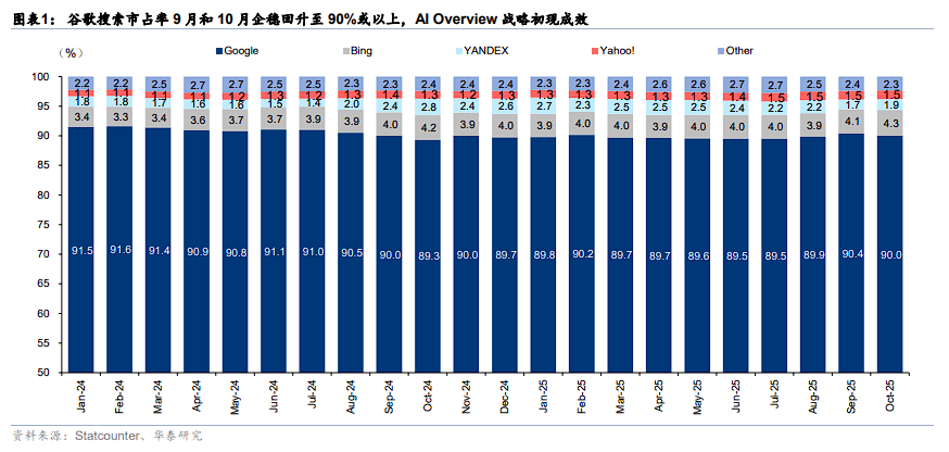 Chrome浏览器正加速Gemini功能融入,新增多项任务执行和情境理解等Agent功能,生态衔接更为完善。AI Overviews功能已服务超20亿用户,为用户提供个性化的搜索结果和内容生成服务。数据显示,9月和10月,谷歌的搜索市占率已回升至90%以上。