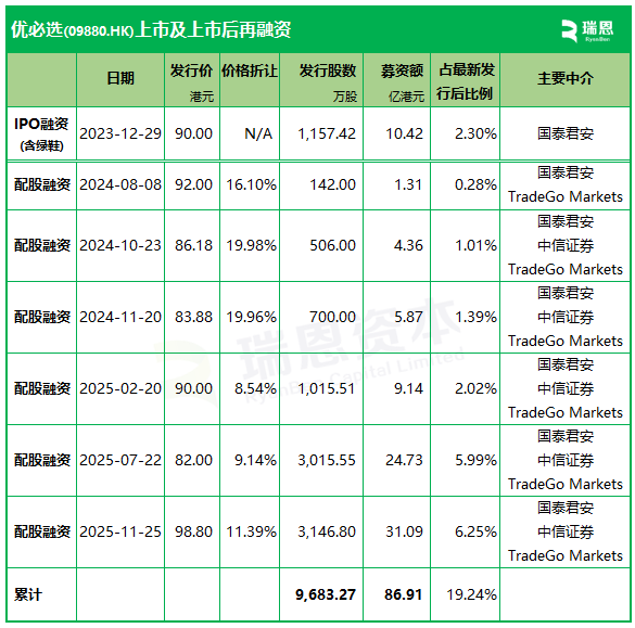 优必选(09880.HK)于周二(11月25日)宣布配股融资,拟以每股98.80港元的价格配售约3146.80万股新H股,募资约31.0904亿港元,经扣除相关费用及开支,募资净额约30.5571亿港元。