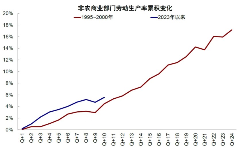 图表:当前AI带来的生产率提升幅度类似于彼时科网行情约1996~1997年时期