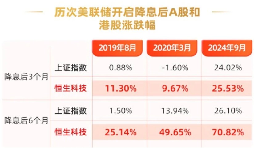 美联储降息周期通道,有利于外资流入港股,历史上美联储降息后3个月、6个月,港股科技资产表现显著跑赢A股。