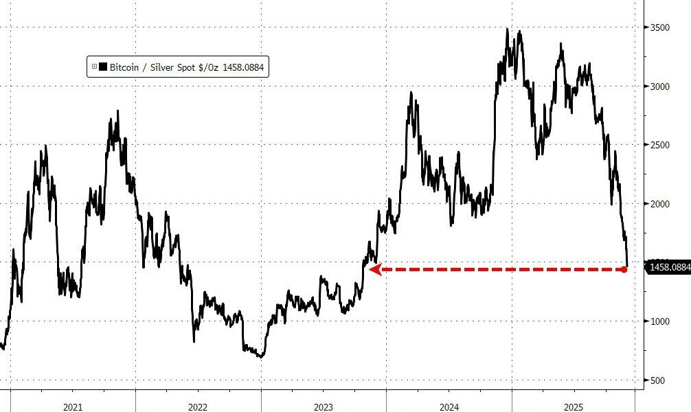 比特币购买力缩水:在一年前,一枚比特币可以购买3500盎司白银;而如今,同一单位的比特币仅能购买1450盎司白银,创下自2023年10月以来的最低点。这一比率的大跌直观地反映了加密资产相对于传统避险资产(如白银)的疲软。