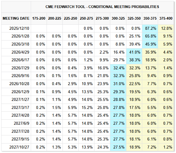 这一调查结果与利率市场对美联储降息前景的预期一致。根据芝商所的“美联储观察”工具,交易员认为美联储在下周降息25个基点的概率达87.2%,在2026年年底前累计降息50个基点、使联邦基金利率降至3.00%-3.25%的概率为29.3%。