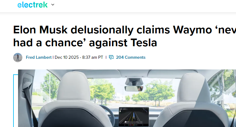 【环球网科技综合报道】12月11日,据electrek报道,近日,特斯拉CEO埃隆·马斯克在社交平台发文,称Waymo在自动驾驶领域“从来就没真正有过胜算”,此番言论引发行业热议。而就在其发声前,Waymo刚公布1亿英里无安全员载客里程的里程碑及详实安全数据,与特斯拉的发展现状形成鲜明对比。