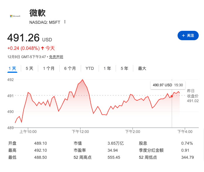 微软股价周二尾盘上涨约0.05%,报491.26美元。