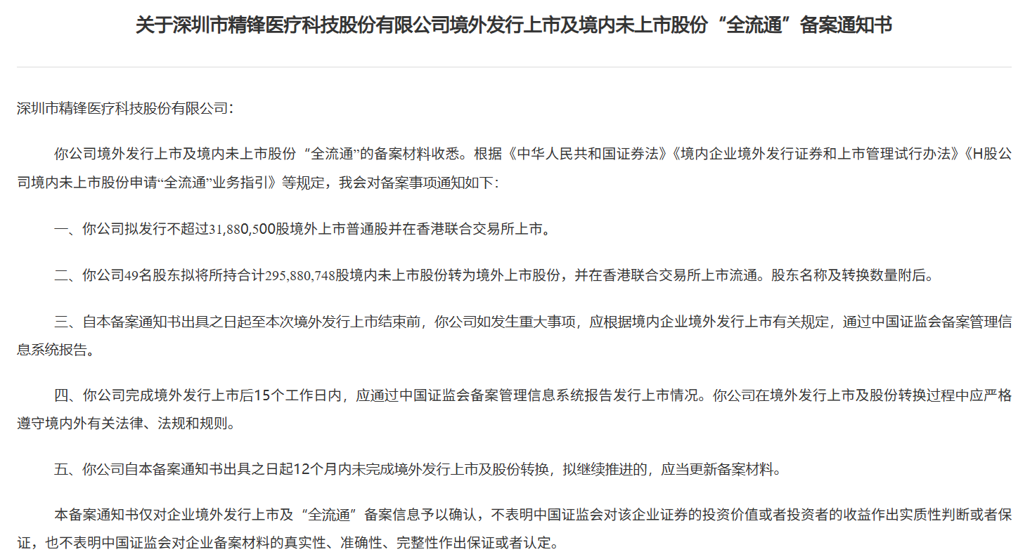 智通财经APP获悉,12月15日,中国证监会国际合作司发布《关于深圳市精锋医疗科技股份有限公司境外发行上市及境内未上市股份“全流通”备案通知书》。精锋医疗拟发行不超过31,880,500股境外上市普通股并在香港联合交易所上市。该公司49名股东拟将所持合计295,880,748股境内未上市股份转为境外上市股份,并在香港联合交易所上市流通。