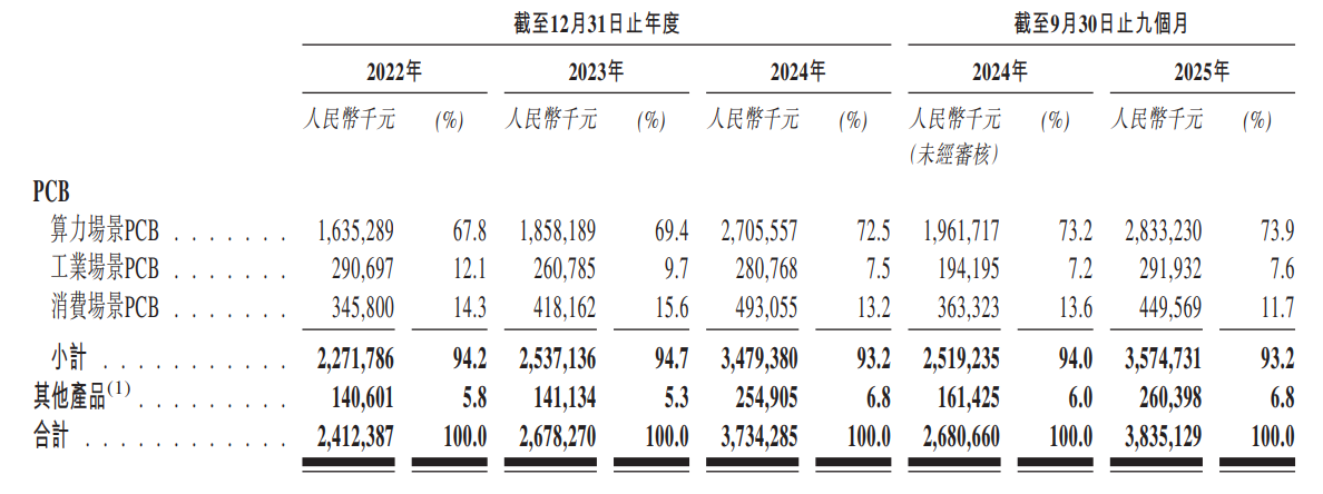该公司PCB产品销售于算力场景、工业场景及消费场景,其中算力场景占需求大头,2022年至2025年前9月,收入份额分别为67.8%、69.4%、72.5%及73.9%,该场景收入保持双位数的复合增速;工业场景收入略有波动,但今年实现高增,前9月增长50.5%,收入份额7.6%;而消费场景收入增长相对稳健,前9月收入份额11.7%。