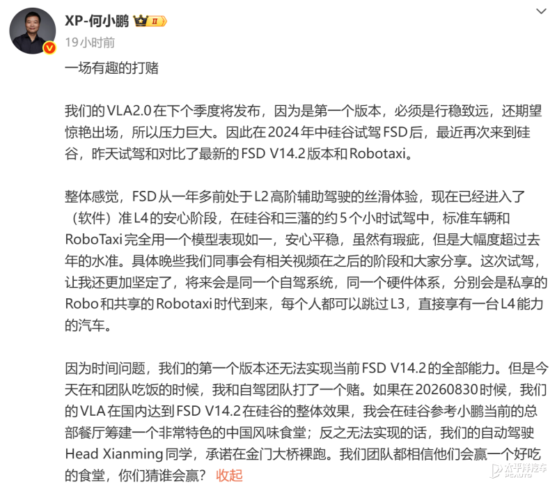 董事长何小鹏作为行业同行,在近期实际体验后评价道,FSD已从一年前“L2高阶辅助驾驶的丝滑体验”,进入“软件准L4的安心阶段”。
