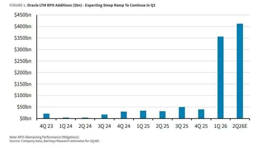 一方面,纸面订单仍在疯狂扩张:受AI需求激增驱动,其剩余履约义务(RPO)余额单季增加了677亿美元,季度末总额达到5230亿美元,意味着当季隐含订单额(Bookings)高达838亿美元,折射出市场对算力的极度饥渴。
