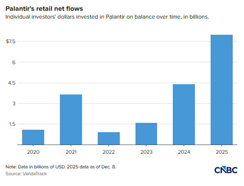 根据VandaTrack的数据,今年以来截至12月8日,散户投资者已向Palantir这只股票投入近80亿美元。这一数字较上年增长逾80%,较2023年更是暴增超过400%。近几年在人工智能(AI)热潮推动下取得的惊人涨幅,使这只股票无可争议地成为散户投资世界的明星——尽管华尔街始终对其估值心存疑虑。