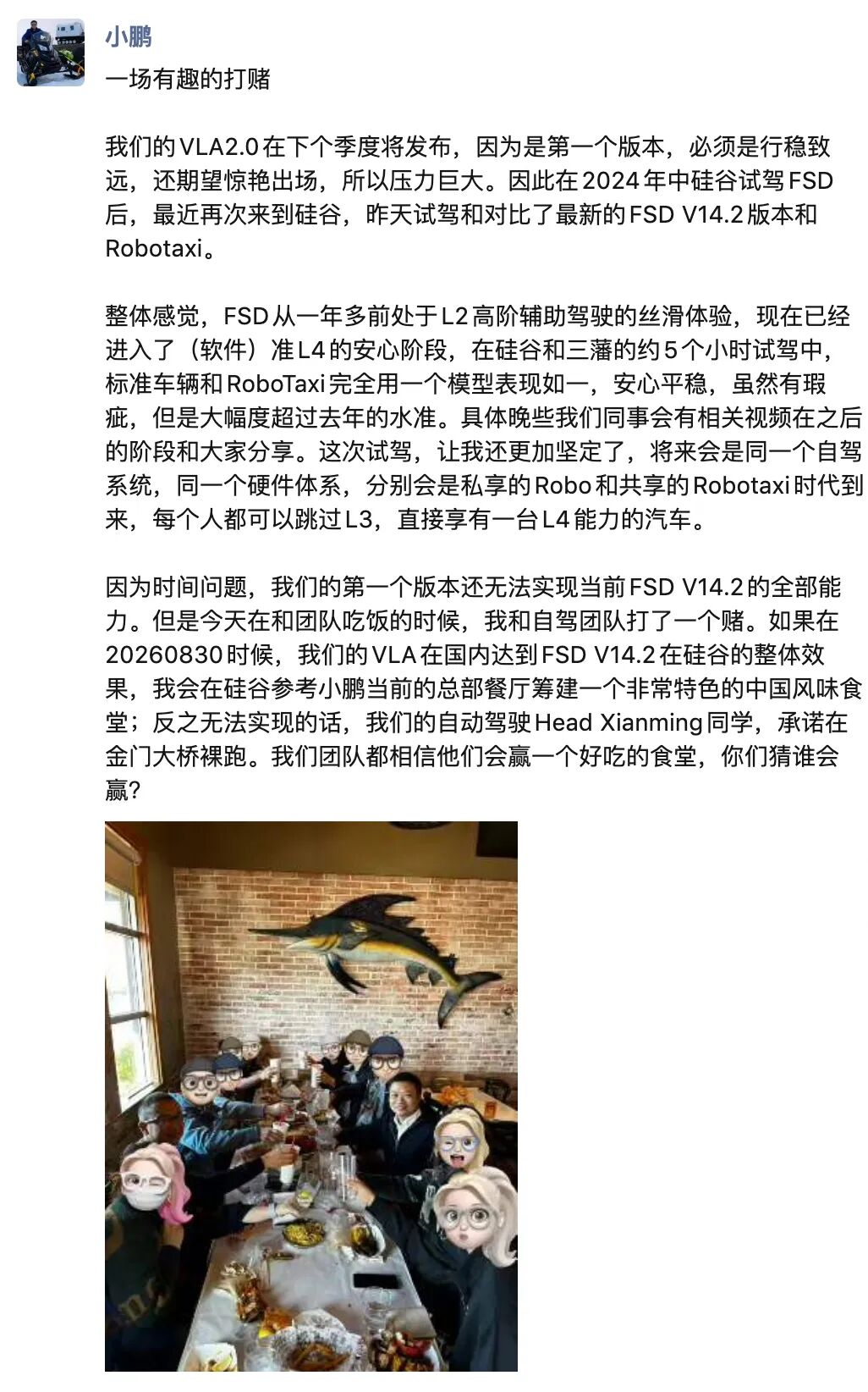 这不是一句空话,何小鹏在社交媒体公开表示,到2026年8月30日,若小鹏VLA技术在国内达到特斯拉FSD V14.2在硅谷的整体水平,将在硅谷筹建中国风味食堂。