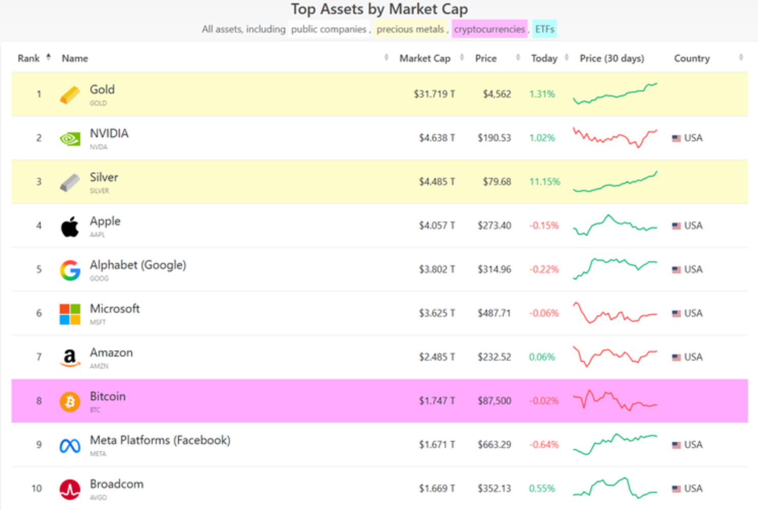CompaniesMarketCap 数据显示,白银市值 4.485 万亿美元;黄金以 31.719 万亿美元居首,芯片巨头英伟达以 4.638 万亿美元紧随其后。前十名完整榜单如下: