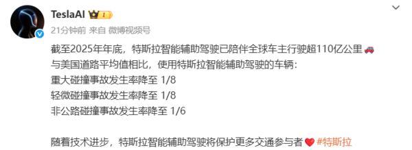 【CNMO科技消息】12月31日,TeslaAI官方宣布,截至2025年年底,特斯拉智能辅助驾驶已陪伴全球车主累计行驶超过110亿公里。与美国道路交通事故的平均发生率相比,在使用特斯拉智能辅助驾驶系统的状态下,车辆的各项事故发生率均实现显著下降。官方公布的具体数据显示:重大碰撞事故的发生率降至1/8;轻微碰撞事故的发生率降至1/8;非公路碰撞事故的发生率降至平均水平的1/6。