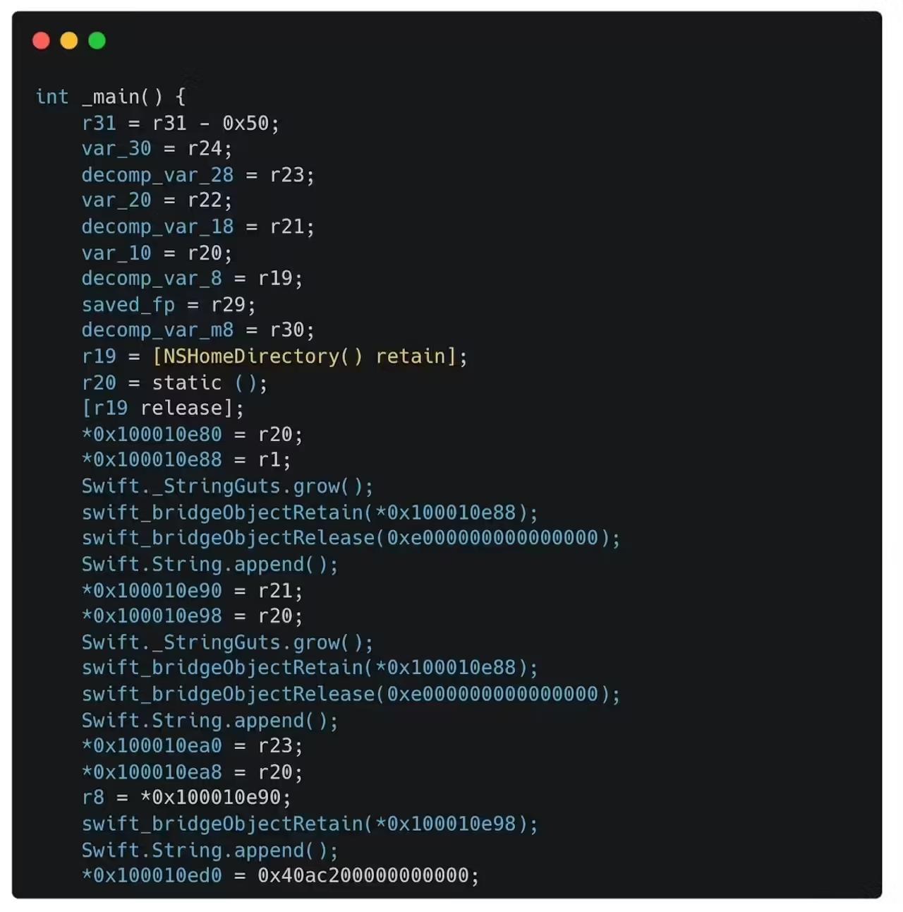 此外,恶意代码往往被封装在看似无害的 Swift 执行文件中,在苹果的静态分析中,它们几乎不执行任何操作,完美避开审核。