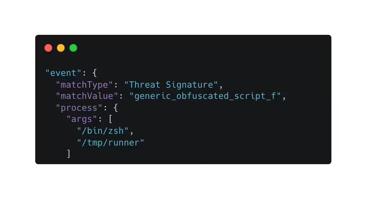 然而,此次样本的异常之处在于,其触发告警的原因并非上述流程,而是一条用于监控混淆 Bash 脚本执行的威胁防护规则。相关事件显示,一个位于 /tmp/ runner 的 shell 脚本正在运行,这一行为引起了研究人员的警觉。