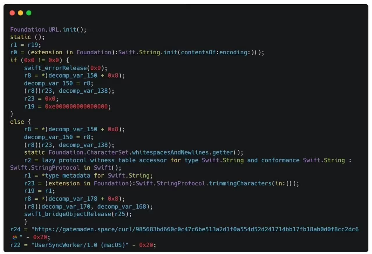 Jamf 随后对应用包内的 Swift Mach-O 可执行文件进行了分析。该文件的 _main 函数作为入口点,用于初始化应用状态和日志路径,执行基础的网络连接检查,并在确认网络可用后获取第二阶段载荷。程序解析用户主目录后,会在~/Library/ Logs / UserSyncWorker.log 创建日志文件,并在~/Library/ Application Support / UserSyncWorker/ 目录中维护 last_up 和 gate 等文件,用于记录执行时间和更新状态。相关文件仅在此前不存在时创建。
