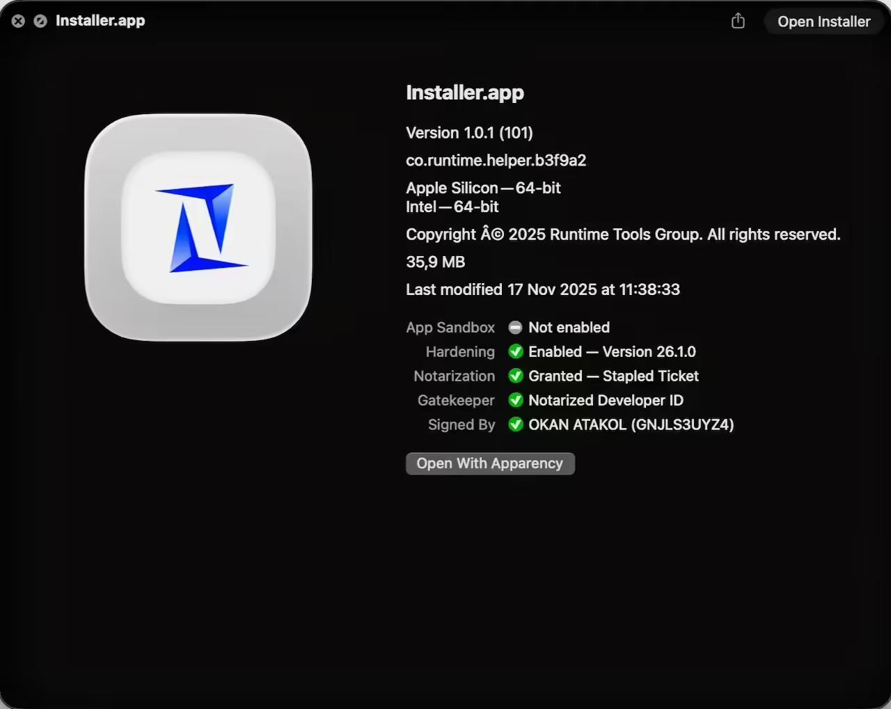 该恶意程序被打包为一个经过代码签名并完成公证的 Swift 应用,包含在名为“zk-call-messenger-installer-3.9.2-lts.dmg”的磁盘映像中,并通过 https://zkcall.net/ download 分发。与以往不同的是,该样本不再要求用户进行任何直接的终端操作,而是通过 Swift 构建的辅助可执行文件,从远程服务器获取并执行一个经过编码的脚本。