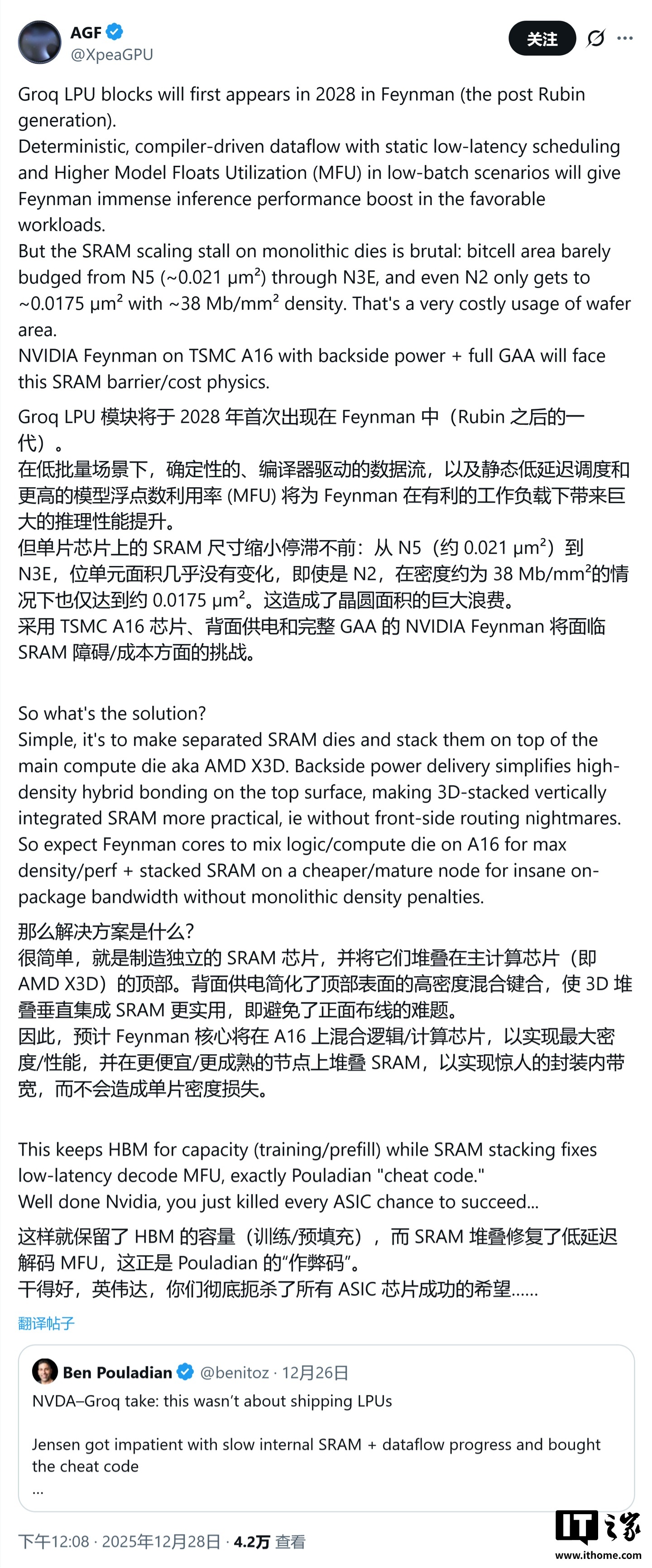 IT之家 12 月 30 日消息,科技媒体 Wccftech 昨日(12 月 29 日)发布博文,报道称英伟达计划在 2028 年推出的“费曼”(Feynman)GPU 中,集成 Groq 的 LPU(语言处理单元)技术,意图借此主导 AI 推理市场。