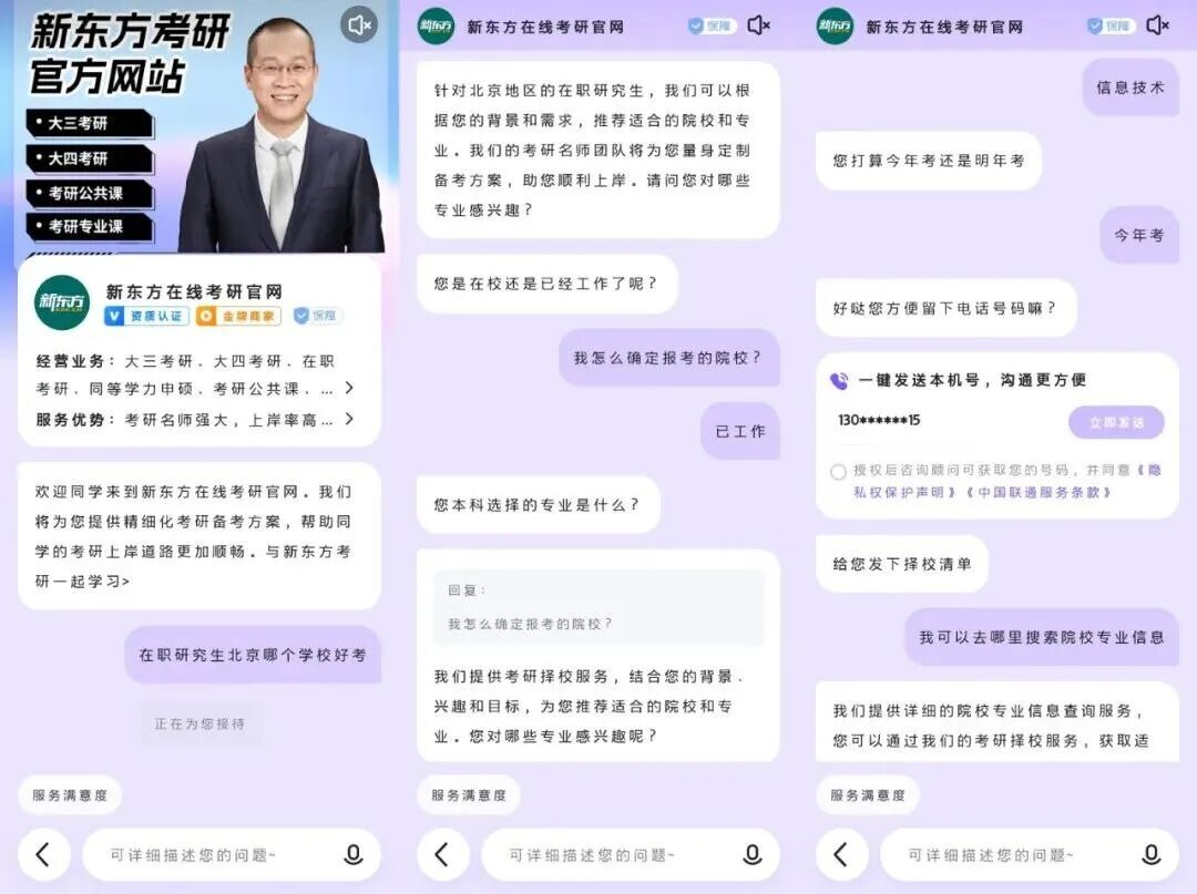 在这种模式下,用户获取信息和找服务的方式更便捷,营销起点亦被彻底重构——一切围绕用户需求展开,在满足用户需求的基础上,再寻找容易激发用户转化的可能性;商业价值也被放大——一次推荐四五家考研机构,意味着在为用户提供充分选择的同时,也实现了多点触达下的商业价值转化。因此,客户ROI获得提升——人工客服的线索开口率5%—6%,商家智能体数量翻倍,并且智能体可以7×24小时不间断服务。