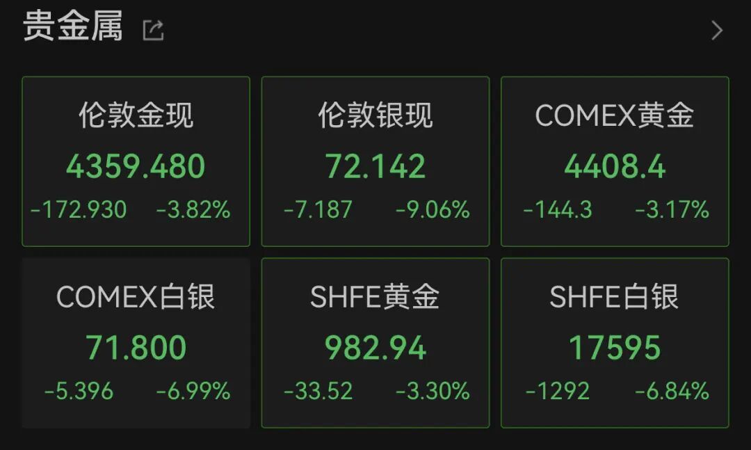值得一提的是,国际金价、银价盘中大跳水,截至发稿,伦敦银现跌超9%,COMEX白银跌近7%;伦敦黄金跌近4%,COMEX黄金跌超3%。