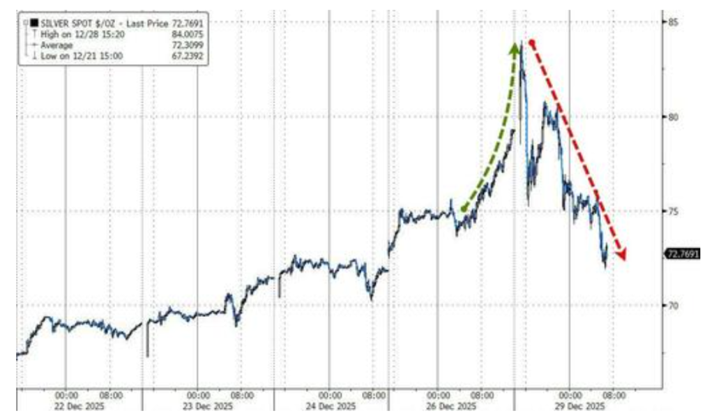 白银价格在首次突破每盎司80美元大关后遭遇急剧回落,终结了近期近乎垂直的上涨行情。尽管市场经历了剧烈波动,但交易员难以找到引发此次暴跌的单一明确催化剂,极端的市场情绪正面临修正。