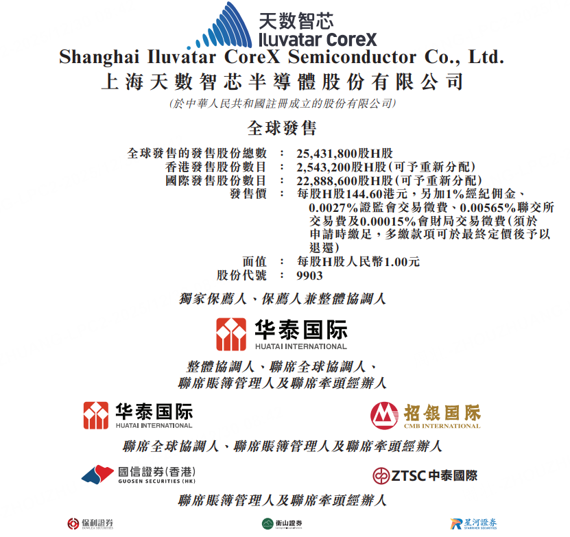 12月30日,天数智芯于12月30日至1月5日招股,公司拟全球发售2543.18万股H股,其中,香港发售占10%,国际发售占90%。每股发售价144.6港元,每手100股,预期将于2026年1月8日开始在联交所买卖。