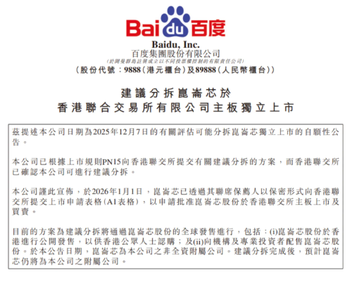 1月2日,是2026年港股首个交易日。当日,百度集团(09888.HK)在港交所公告称,旗下AI芯片公司昆仑芯已经于1月1日以保密形式向港交所提交上市申请表格,拟分拆上市于港交所交易。百度强调,分拆完成后,昆仑芯仍将是百度的附属公司。