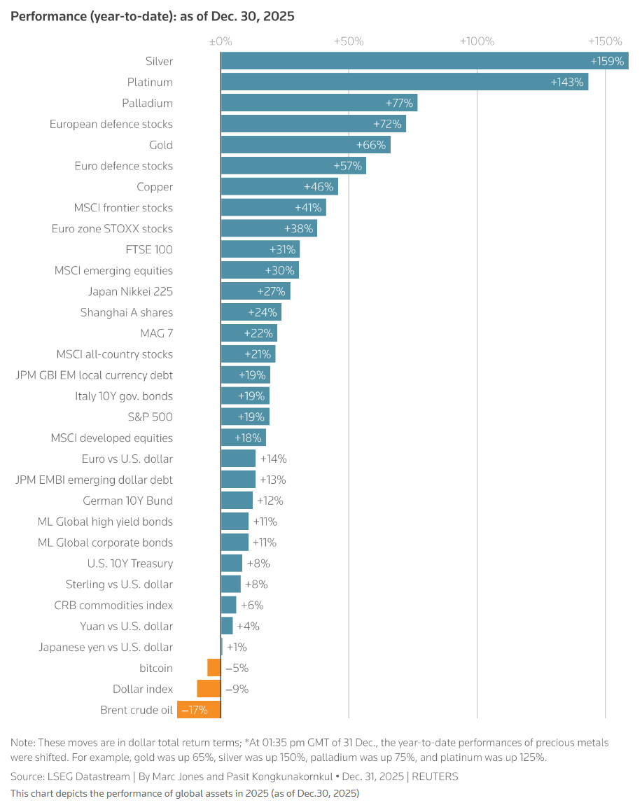 全球股市从4月“解放日”关税政策引发的暴跌中强势复苏,2025年全年涨幅达21%,在过去七年里第六度实现两位数增长。然而,放眼其他资产类别,意外之处比比皆是。