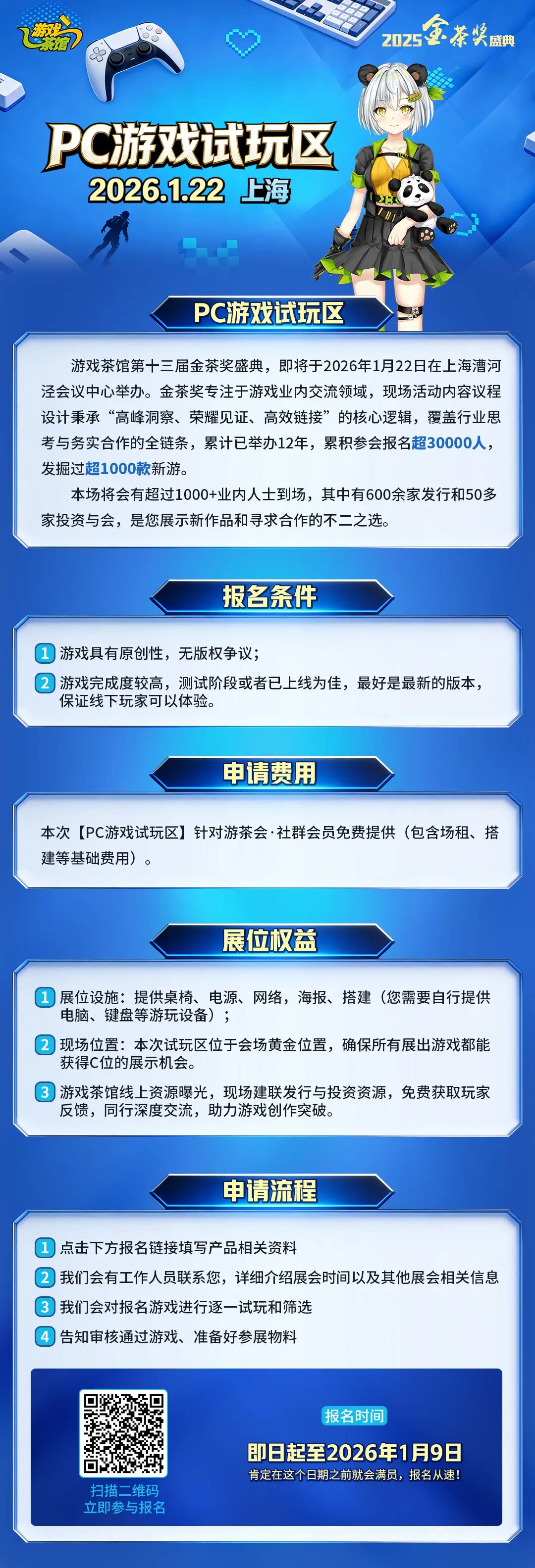 距离第十三届金茶奖举办的【PC游戏试玩区】报名截止时间还有3天,还没有报名的小伙伴们,赶快点击阅读原文报名或扫描下方图中二维码。
