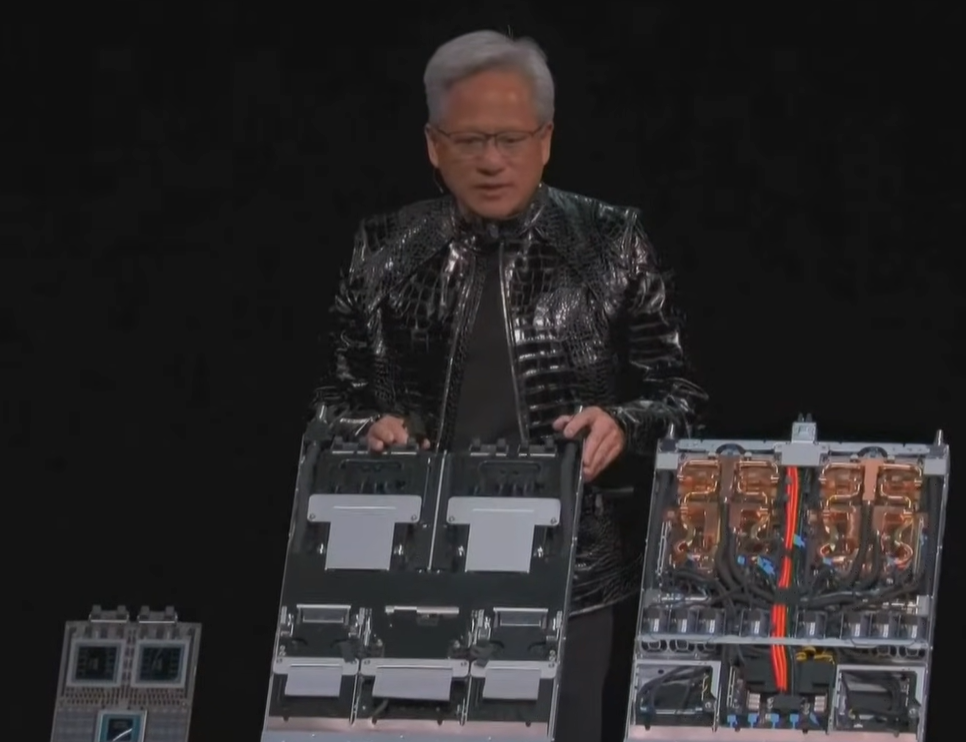 这总共有两英里的铜缆,5,000 根铜缆。这使得 NVLink Spine 成为可能。这是真正开启了 NGX 系统的革命,我们决定创建一个行业标准系统,以便整个生态系统、我们所有的供应链都可以标准化这些组件。有大约 80,000 个不同的组件组成了这些 NGX 系统。