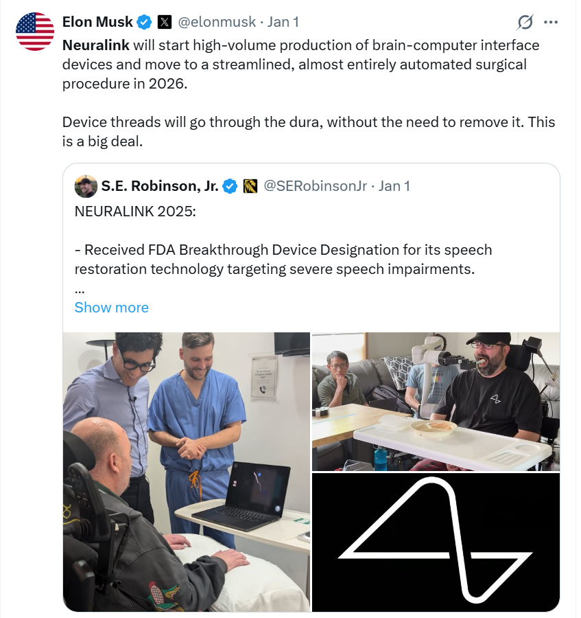 开源证券在最新的研报中指出,Neuralink的规模化生产预期与自动化手术方案具备双重里程碑意义。这不仅标志着脑机接口正从“医疗试验工具”向“可普及产品”跨越,也为未来与特斯拉Optimus人形机器人的协同应用奠定基础。