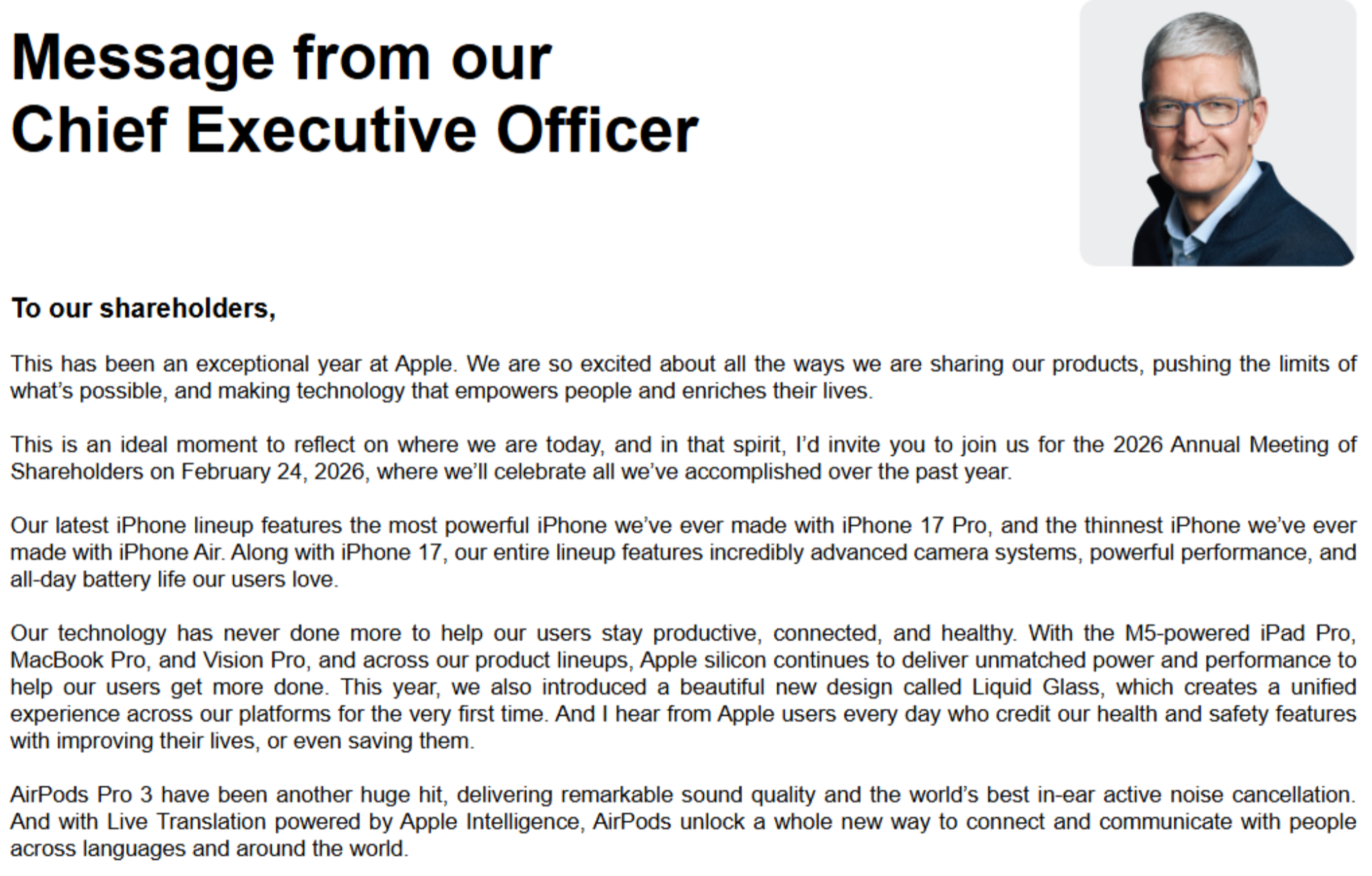 ▲蒂姆·库克在2026年股东大会的部分致辞(图源:苹果官网)
