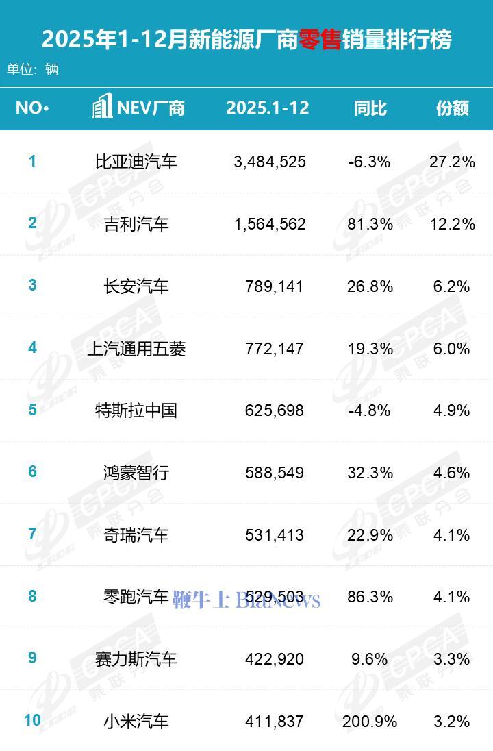2025全年新能源厂商零售排行榜中,比亚迪汽车、吉利汽车、长安汽车、上汽通用五菱、特斯拉中国分别位列前五。