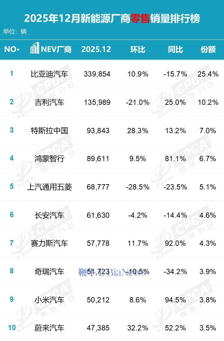 12月新能源厂商零售销量排行榜中,比亚迪汽车、吉利汽车、特斯拉中国、鸿蒙智行、上汽通用五菱分别位列前五。