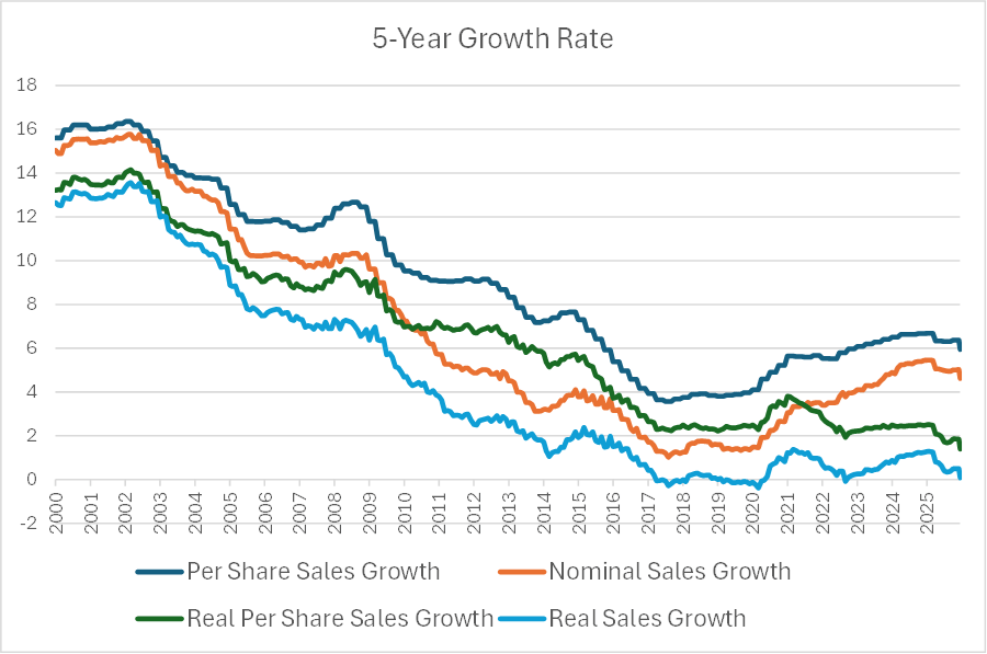 该图表展示了五年期每股销售额的年化同比增速(含绝对值与通胀调整后数值),以及整体销售额的名义增速与实际增速。