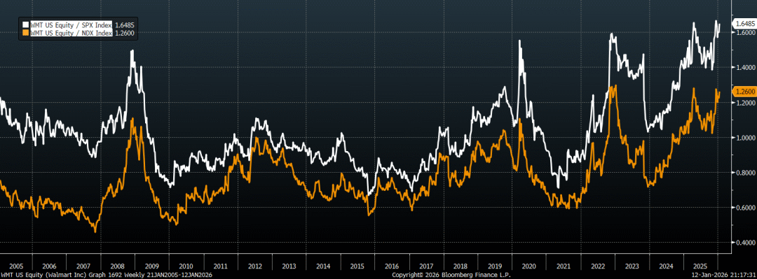 当前,沃尔玛相对于标普 500 与纳斯达克 100 指数的估值溢价已创历史纪录,这意味着,唯有实现前所未有的销售额增长与利润率扩张,才能支撑起当前的估值水平。